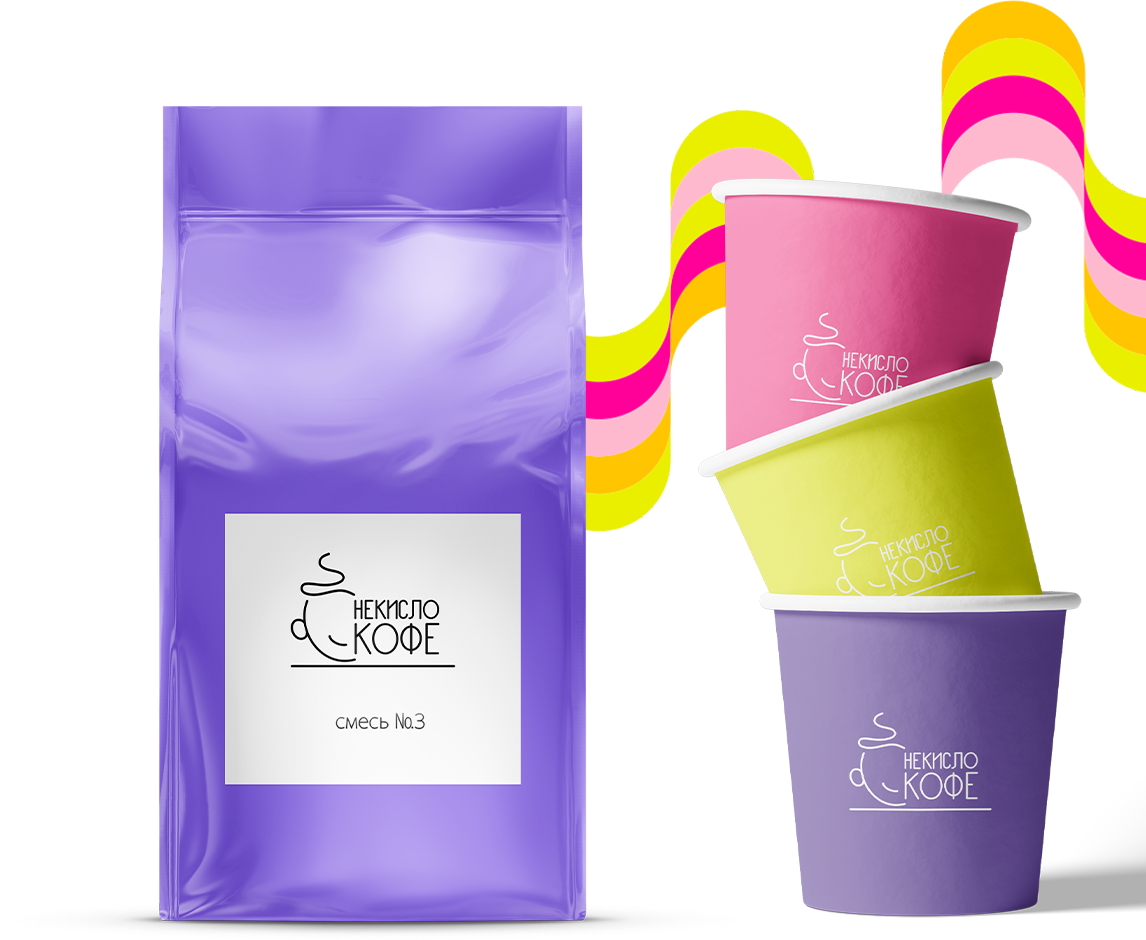 Нейминг. Мы начали работу над названием с маркетингового анализа рынка, конкурентов и целевой аудитории. Маркетолог обнаружил интересную деталь, за которую мы и зацепились: при выборе сорта кофе покупатели чаще всего пишут пожелание «чтобы не было кисло». Отсюда появилось название НЕКИСЛО КОФЕ — как и хотелось, оно получилось необычным, цепляющим и со смыслом.